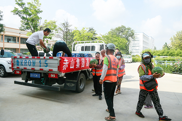 8月15日上午,赤山集团组织开展送清凉活动,为石岛管理区园林、环卫、交警这些单位高温下坚持工作的一线工作者送去西瓜和矿泉水等解暑物资,对他们的辛勤付出表示感谢和慰问。